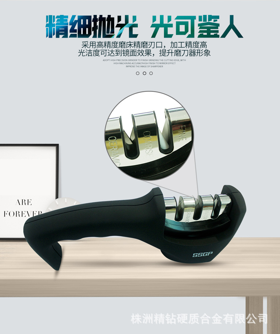 鎢鋼刀片表面經(jīng)過(guò)精細(xì)拋光工藝處理,達(dá)到鏡面效果,光可鑒人,提升磨刀器形象.